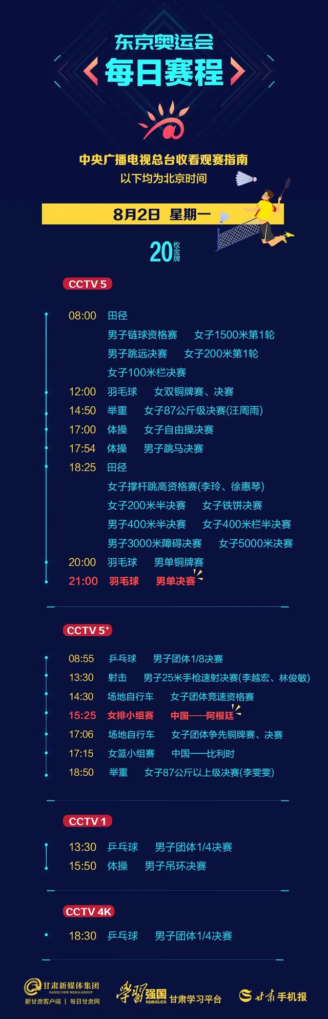 羽毛球项目将在下午举行女子双打奖牌赛,晚上进行男子单打奖牌赛。从下午16时开始,体操将陆续决出男子吊环、女子自由体操、男子跳马冠军。当天,场地自行车将决出女子团体争先赛冠军,马术三项赛将产生个人场地障碍冠军。期待在这些决赛场次,中国选手都能有好的发挥。