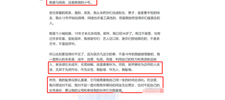 但是时至今日,即便是曾经被粉丝们捧着极高的一线明星也终将要终止自己的演绎生涯,事情发生之后,娱乐圈儿的多位名人都因吴亦凡而受到影响,随后马薇薇也曾经宣称自己要退圈,因为曾经2016年的自己万万没有想到他是这么一个可怕的人,也没有想过他为了满足个人私欲,竟然走上违法犯罪的道路,自己深知个人行为已经构成了为虎作伥,更是有悖于一名女性该有的认知和判断。