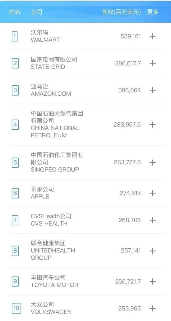 从具体排名看,沃尔玛连续第八年成为全球最大公司,中国的国家电网公司上升至第二位,亚马逊首次进入前三,苹果公司前进至第6位。
