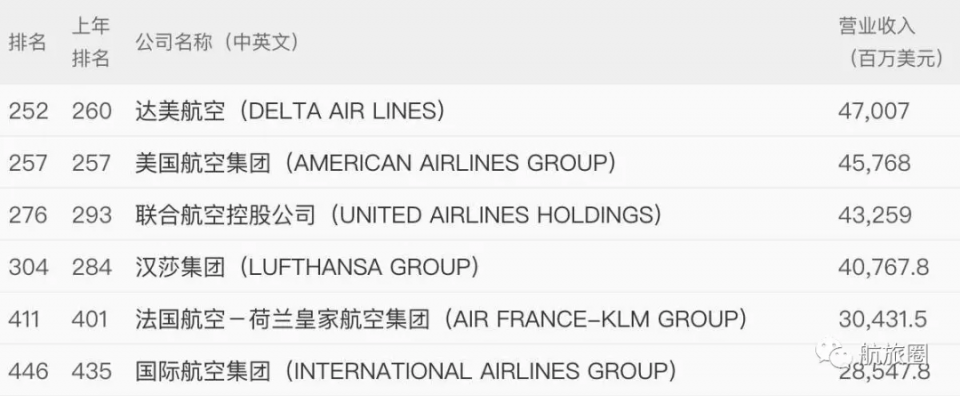 在2020年发布的《财富》全球500强名单中,全球共有6家以航空运输为主业的企业——达美航空、美国航空集团、联合航空控股、汉莎集团、法航-荷航集团、国际航空集团挤进500强。
