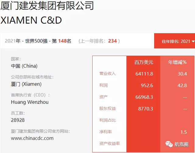 而厦航第二大股东厦门建发集团,2020年营收同比增加30.4%,排名由第234名进一步前进至第148名,利润也同比增长42.8%。