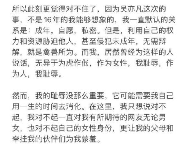 这一次事件在吴亦凡被刑拘之后再一次的说出来了,马薇薇还出来道歉了,说吴亦凡这件事情,是16年前额自己不能够想象的,马薇薇一直默认的关系就是成年,自愿和私密。而如今马薇薇认为吴亦凡的行为就是禽兽所为,马薇薇因为自己曾经的为虎作伥感到耻辱,也为自己作为一名女性而耻辱。