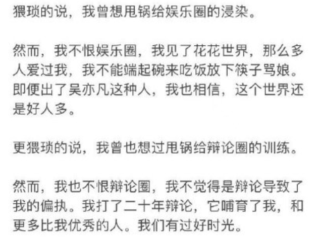 不过马薇薇曾经也是想过要怨恨辩论圈的训练。她说自己不怨恨娱乐圈,她不觉得是辩论导致了她的偏执,其实马薇薇有这样的想法,跟辩论也还是有一点关系的吧。毕竟有很多诡辩的想法和观点。慢慢的也就走偏了。从这一点看,就不得不说的想要当一名辩手,就更要三观正了。不然连自己都说服不了。