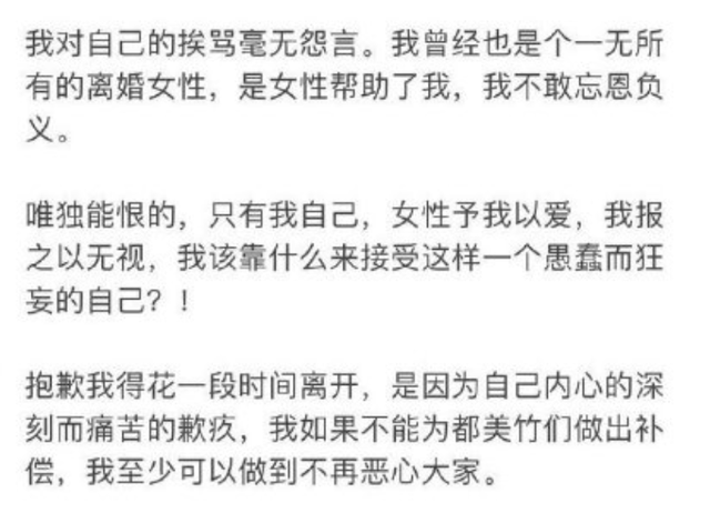 马薇薇说她对自己的挨骂没有什么怨言。她自己就是一个离婚的女性,本应该是更加心疼女性的才对,但不知道为什么她会说出这样的话来。但这件事情之后,其实马薇薇自己也意识到了自己的错误。她说自己要离开一段时间了,是因为她自己内心的歉疚,她觉得自己要是不能为都美竹和其他受害者做一些什么补偿的话,至少可以的做到不出现恶心大家。