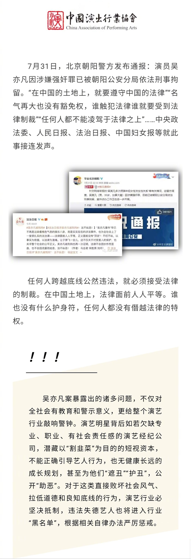 【摘要】 导读:吴亦凡被刑拘后,继人民日报、中央政法委、央视等官方纷纷发声谴责不良艺人,演艺圈业内的官方声音也出来了。中国影协、中国音协、中