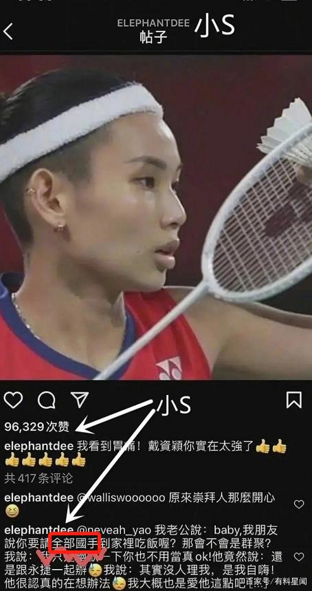 再结合奥运会期间,小S对台北的几位选手一直都十分关注,戴资颖参加半决赛时,小S还发文力赞戴资颖太强了,透露想要邀请全部“国手”到家里吃饭。