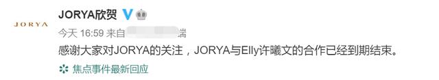 JORYA发文与小S女儿Elly的合作已经到期结束。