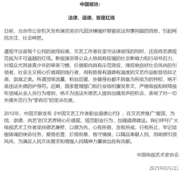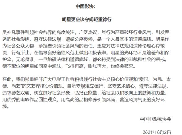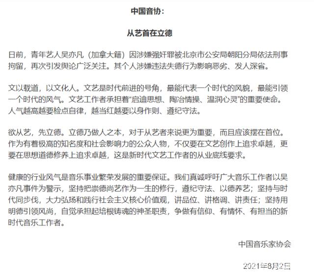 就在8月2日晚,中国电影家协会、中国音乐家协会、中国电视艺术家协会分别就吴亦凡事件发声。