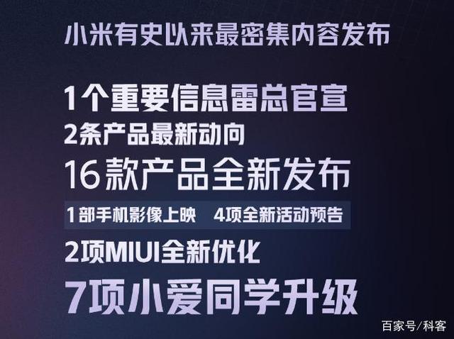 其他方面,还会有16款新品发布、1部手机影像上映、4项全新活动预告、2项MIUI全新优化以及7项小爱同学升级。这些内容将由相关的负责人进行主讲。感觉除了雷军将要公布的重磅信息外,这次直面会的重点会在生态链新品发布,还有小爱同学升级上。有相关需求的米粉也不容错过了。