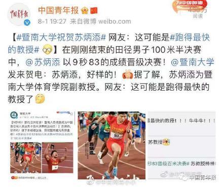 东京奥运会男子100米半决赛上,苏炳添以个人最好成绩9秒83,创造新的亚洲纪录。据了解,苏炳添是暨大2017届国际经济与贸易专业硕士,同样是暨南大学体育学院副教授。而苏炳添的公开课,也是暨大选修课里最难抢的课程。