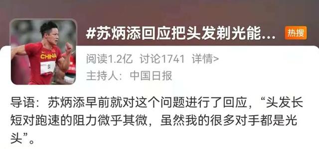 有网友好奇,头发短点是不是能跑得更快?今天,#苏炳添回应把头发剃光能不能跑得更快#的话题词就冲上了热搜。