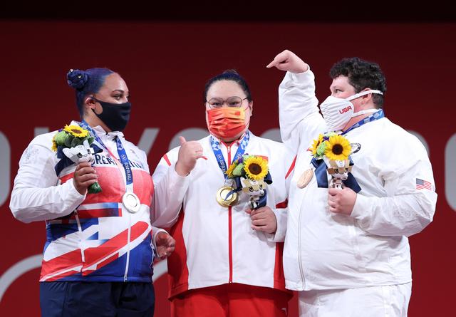 新华社照片,东京,2021年8月2日 (东京奥运会)(12)举重——女子87公斤以上级:中国选手李雯雯夺冠 8月2日,冠军中国选手李雯雯(中)、亚军英国选手坎贝尔(左)与季军美国选手罗布莱斯在颁奖仪式上。 当日,在东京奥运会举重项目女子87公斤以上级比赛中,中国选手李雯雯夺得冠军。 新华社记者 杨磊 摄