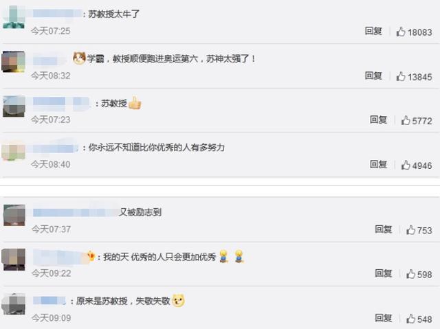 对此,有网友评论“你永远不知道比你优秀的人有多努力”、“学霸、教授顺便跑进奥运第六,苏神太强了!”、“有被励志到”、“优秀的人只会更加优秀”。
