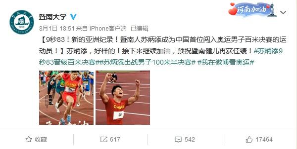 在8月1日晚上举行的东京奥运会男子100米决赛中,苏炳添以9秒98,获得第六名的成绩,在半决赛中跑出9秒83的成绩,打破了亚洲记录。苏炳添在广东中山出生及成长,据了解,苏炳添是暨大2017届国际经济与贸易专业硕士,同样是暨南大学体育学院副教授。而苏炳添的公开课,也是暨大选修课里最难抢的课程。