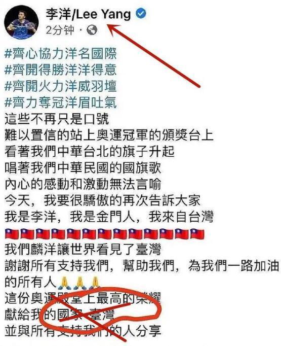 比如羽毛球运动员李洋,他在ins 上发文时称,这份奥运殿堂上最高的荣耀,献给我的国家-台湾,这样的言论,无疑代表着他是台独。