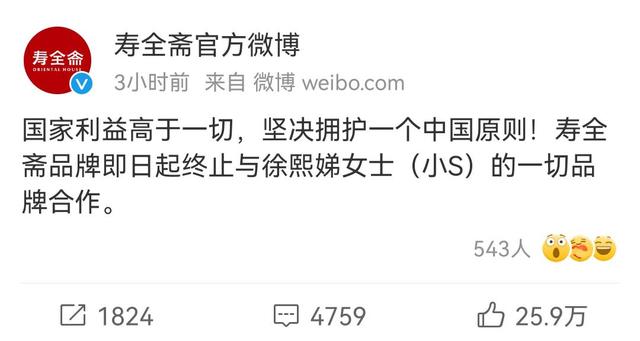 在小S此番言论登上热搜后,立刻有和小S合作的品牌方发文,宣布和小S解约。寿全斋表示,“国家利益高于一切,坚决用户一个中国原则!寿全斋品牌即日起终止与徐熙娣女士(小S)的一切品牌合作。”