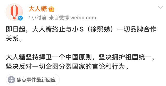 大人糖也发文宣布:“即日起,大人糖终止与小S(徐熙娣)一切品牌合作关系。”