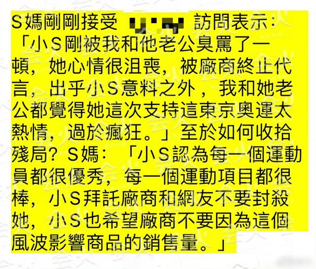 舆论闹大之后,小S母亲在接受采访时表示:小S刚被我和她老公臭骂了一顿,她心情很沮丧,被厂商终止代言,出乎小S意料之外,我和她老公觉得她这次支持东京奥运太热情,过于疯狂。她又补充道:“小S认为每一个运动员都很优秀,每一个运动项目都很棒,小S拜托厂商和网友不要封杀她,也希望厂商不要因为这个风波影响商品的销售量。”