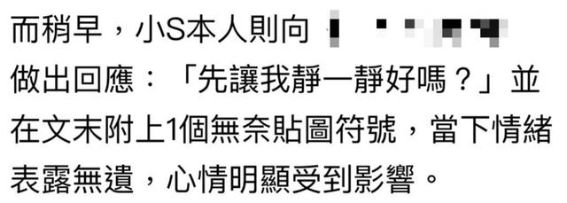 小S对此事进行回应是,“先让我静一静好吗?”看得出来,她当下的情绪低落,心情明显受到影响。
