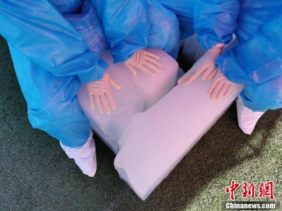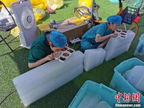 河南省肿瘤医院后勤部门为室外核酸检测点送来冰砖降温。(韩章云 摄)