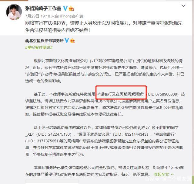 而且其家人的私生活也开始被人打扰,这个时候,张哲瀚的工作室出来做出声明了,称这些黑子恶意诬蔑艺人和其家人的方式实在是令人气愤,于是第二次发出了声明以及律师函。张哲瀚通过这个声明否认了隐婚生子的传言,但是却不对单身未求婚这一点做出澄清,于是粉丝还是有一点没办法接受。而工作室给出的律师函,居然把张哲瀚的氪金大粉直接状告了。