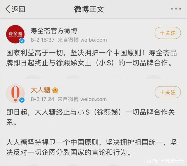 明星艺人作为公众人物,一言一行备受关注,尤其涉及到祖国统一的问题,更是要谨慎。小s言论被曝光后,国产品牌纷纷宣布与其解约,目前清扬、大人、欣贺、寿全斋等已第一时间宣告解约。