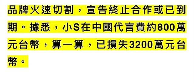 据媒体透露,小s在国内代言费约800万元台币,此次品牌解约,小S将损失3200万元台币。网友指责小s来大陆只为赚钱,背地里却是双面人。有网友称,小s在大陆的代言费是台湾的130倍,这次小s要凉凉了。
