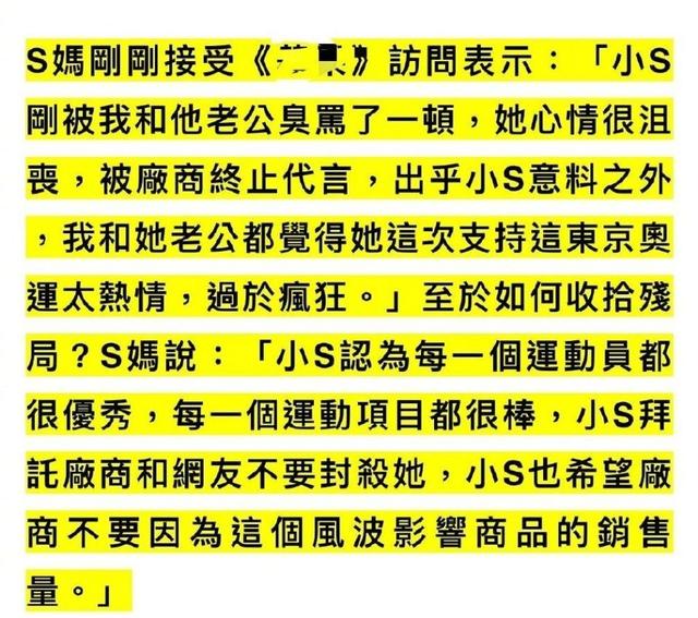 随后,小s的妈妈接受采访,为小s求情,称“小s刚被我和他老公臭骂了一顿,她心情很沮丧。被厂商终止代言,出乎小s的意料。她这次支持东京奥运会太热情、过于疯狂。拜托厂商和网友不要封杀她,也希望厂商不要因为这个风波影响商品的销售”。