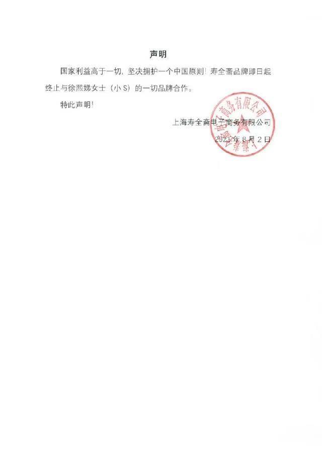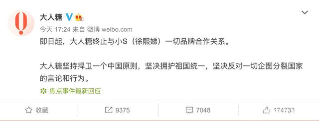 日前,小S因在某社交平台上发表不当言论后引发热议,寿全斋官方微博和大人糖今日下午纷纷发出声明,终止和小S的品牌合作。