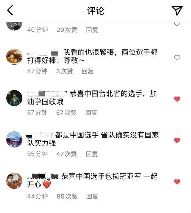 对于“国手”这个词,网友们纷纷在她的评论区留言纠正:“恭喜中国台湾省的选手”,“恭喜中国选手包揽冠亚军”。