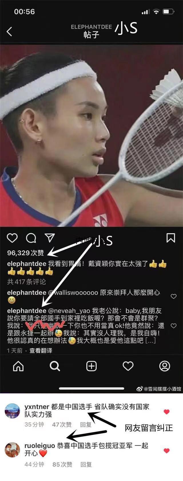 据悉,在8月1日晚,陈雨菲获得羽毛球女单金牌,中国台北运动员戴资颖获得银牌,小S在观看这场比赛后,在个人社交平台发文“虽败犹荣,但我差点暴毙”,并配上了戴资颖的照片。