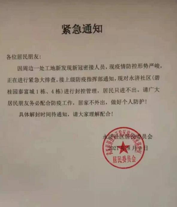 武汉经开区永济社区居民接到的通知称,因周边一处工地新发现新冠密接人员,正在进行排查,接上级防疫指挥部通知,现对永济社区(碧桂园泰富城1栋、4栋)进行封控管理,居民只进不出。