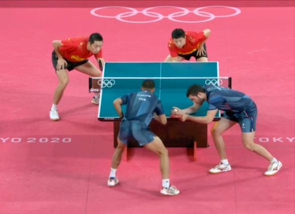 法国队的双打向来是不错的,曾经拿过奥运会的铜牌,如今在欧洲也有两把刷子。但可惜的是,莱贝松/卡辛今天的对手是拿过世乒赛男双冠军的国乒组合马龙/许昕,然后就没有然后了——0-3惨败(6-11、5-11、7-11),法国双打组合率先丢1分。