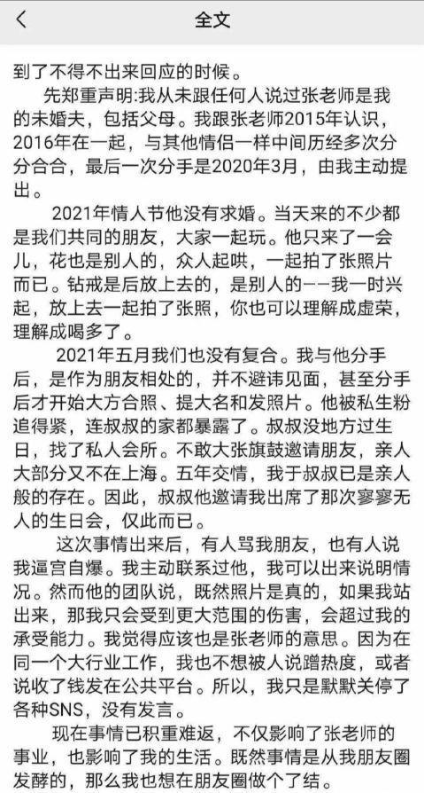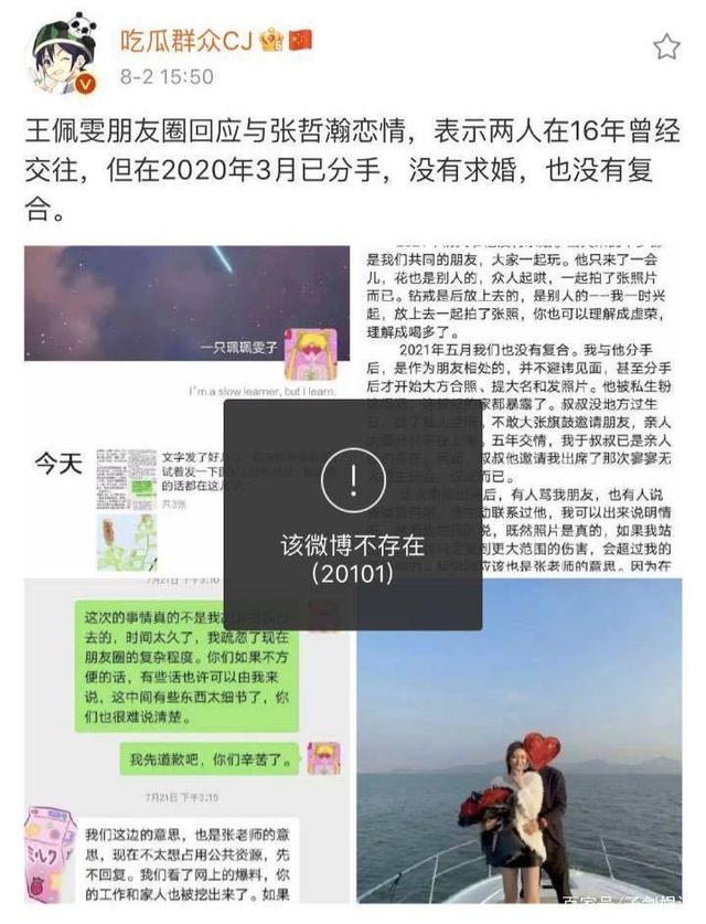 截图内容里,疑似是王佩雯回应与张哲瀚恋情一事。其中,女方自称在2015年与张哲瀚相识,2016年走到一起。不过两人期间经历分分合合,最终于2020年3月分手。