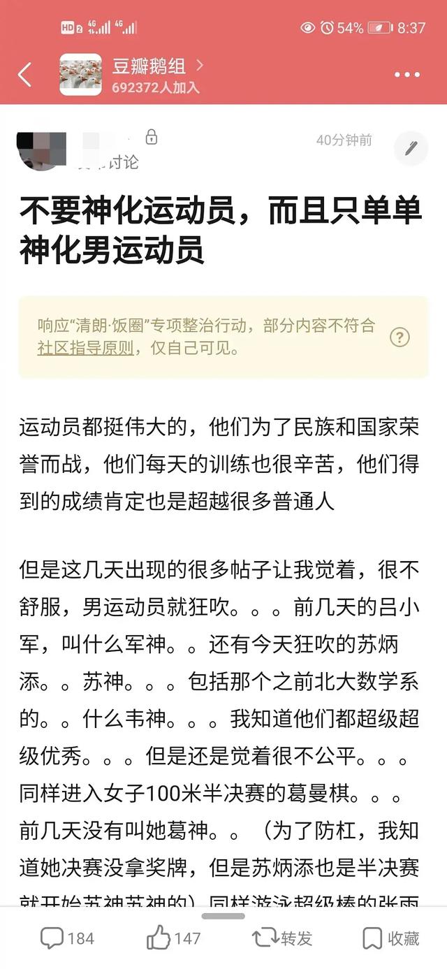 在某论坛中,有一名用户发表了一篇以“不要神话运动员,而且只单单神话男运动员”为标题的文章。文章大意为国人对男运动员取得一点成绩就大吹,而对于同样取得优异成绩的女运动员则不闻不问。