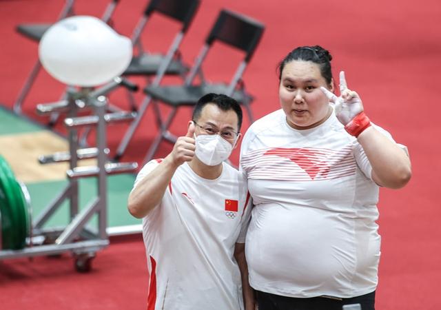 7月20日,中国女子举重队主教练张国政(左)和队员李雯雯在热身训练中。新华社记者杨磊摄