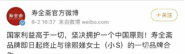 寿全斋与小S终止合作, 国 家 利 益 高 于 一 切,网友说做得好 。