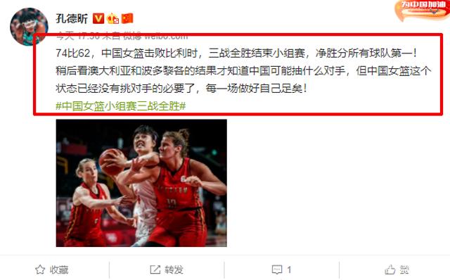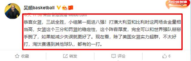 同样的,名嘴“吴頔basketball”也在网络上点赞,“恭喜女篮,三战全胜,小组第一挺进八强!打澳大利亚和比利时这两场含金量相当高,女篮这个三分和罚篮的稳定性,这个阵容厚度,完全可以和世界强队掰掰手腕了,如果能减少失误就更好了。现在看,除了美国女篮实力超群,不太好打,淘汰赛遇到其他球队,都有得一打。”