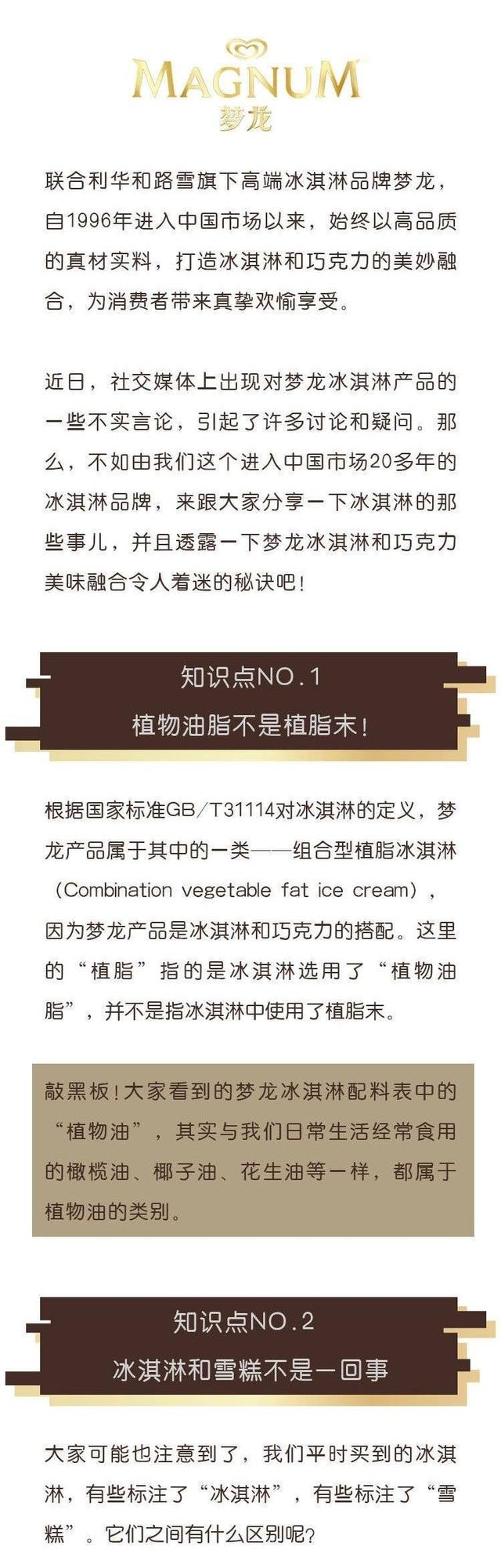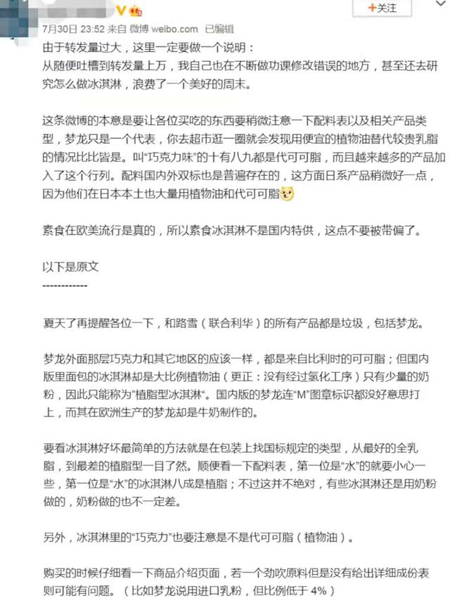 7月30日,网友“游戏打折情报”发布微博称,“和路雪(联合利华)的所有产品都是垃圾,包括梦龙。 梦龙外面那层巧克力和其他地区的应该一样,都是来自比利时的可可脂;但国内版里面包的冰淇凌却是大比例使用人造植物奶油,只有少量的奶粉,因此只能称为‘植脂型冰淇凌’。”该条微博还称,国内版的梦龙连“M”图章标识都没(好)意思打上,而其在欧洲生产的梦龙却是牛奶制作。