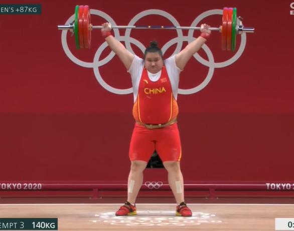 在所有选手比完之后,李雯雯终于登场。第一把李雯雯轻松举起130公斤,随后又自己跟自己比赛,轻松举起135和140公斤,打破了奥运会纪录。抓举比赛结束,李雯雯已经领先第二名12公斤了。
