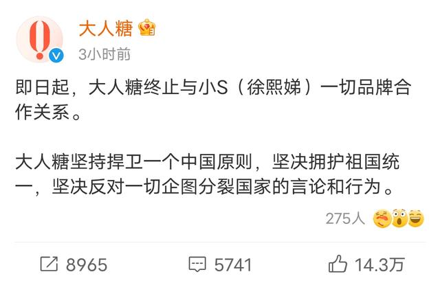 即日起,大人糖终止与小S(徐熙娣)一切品牌合作关系。大人糖坚持捍卫一个中国原则,坚决拥护祖国统一,坚决反对一切企图分裂国家的言论和行为。