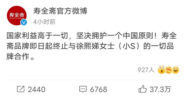 一个小时后,寿全斋官博也紧跟其后发文称国家利益高于一切,坚决拥护一个中国原则,宣布与小S终止一切品牌合作。