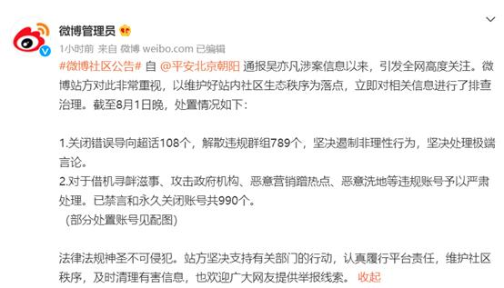 8月1日晚10时,@微博管理员 发布微博社区公告称,自@平安北京朝阳 通报吴亦凡涉案信息以来,引发全网高度关注。微博站方对此非常重视,以维护好站内社区生态秩序为落点,立即对相关信息进行了排查治理。截至8月1日晚,处置情况如下: