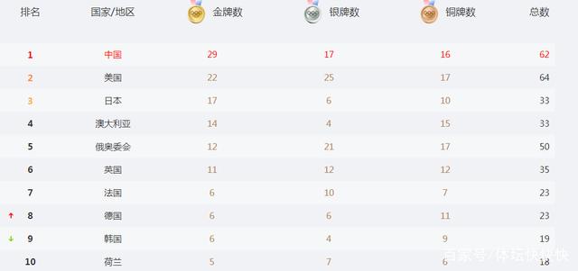 8月2日的比赛结束之后,中国军团以29金17银16铜的成绩继续排在奖牌榜第一位;美国队22金25银17铜排在第二位;日本队17金6银10铜排在第三位,值得一提的是,日本代表团在今天的比赛中没有金牌进账。