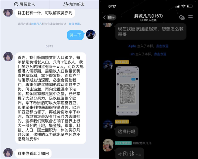 吴亦凡的疯狂粉丝们吴亦凡粉丝组成“解救凡凡”群竟有1167名成员?看下面这张图,粉丝们开始商量解救吴亦凡的方法了,甚至要攻占俄罗斯?建立“吴亦凡联合国”?虽然这个段子明显是调侃,但当小编看到“解救凡凡”群居然有1167名群员时,还是非常震惊,这么迅速就组织起来了吗?这样的冲动和无知是很危险的,小编真心提醒一下吴亦凡的女粉们,小心骗子,比如说“筹钱救吴亦凡”啥的!