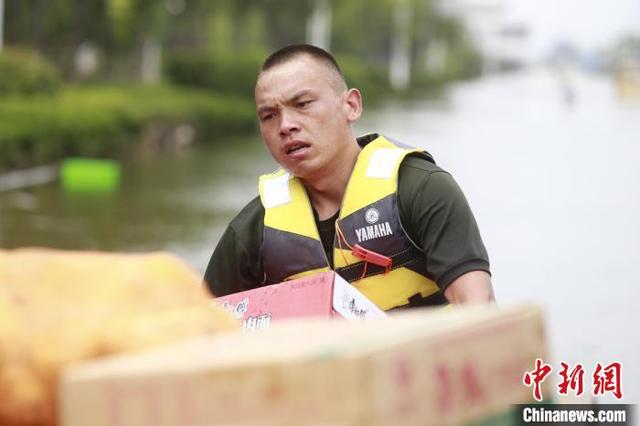 图为贺乐在抗洪一线搬运救灾物资。霍亚平 摄