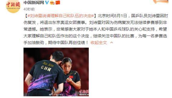 刘诗雯今年已经30岁了,东京奥运会很有可能是她职业生涯中最后一届奥运会,她没能完成要在奥运会中摘金的目标,输掉比赛之后的刘诗雯非常伤心,在采访时一度哽咽难言,看得人一阵阵心疼。在混双项目中失利,我们还有机会在团体赛中找回来,但是刘诗雯的伤病在打完混双决赛之后复发了,她的手肘伤势严重,已经无法上台比赛。无奈之下只好退出团体赛,由中国新生代小将王曼昱顶上刘诗雯的位置。