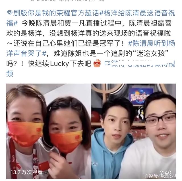 陈清晨训练很辛苦,但杨洋给了她很大的鼓励,杨洋生日的时候,陈清晨还发文送祝福了,就跟饭圈女孩一样,现在听到杨洋的语音立马哭了,激动的心情很能理解,也期待两人能合作。