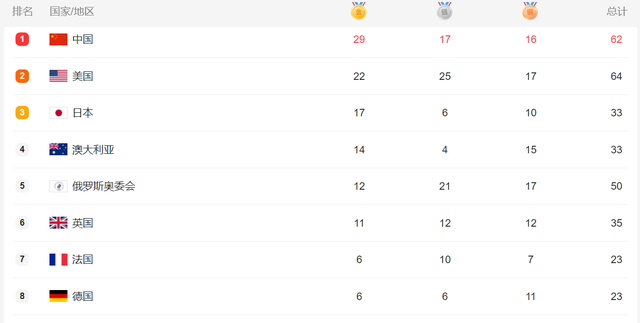 因为排行第四的澳大利亚,目前已获得了14金,第5的俄罗斯12金,第6的英国11金,第7的法国和第8的德国,第9的韩国则都是6金。也就是说第4到第6的这三支队伍,其实距离日本队都很近,接下去的项目若能有所突破,日本队恐怕很难保住前三的位置。而在总奖牌数量方面,中国队也已有62枚奖牌入账,与美国的64枚奖牌只有2牌之差,后半程很有机会实现反超。因此我们也期待中国队能再造惊喜,带来更多精彩的表现,争取收获更多的金牌!
