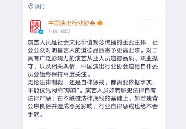 吴亦凡小编的话:8月2日,“中国影协”、“中国音协”、“中国视协”同时就“吴亦凡涉嫌强奸被刑拘事件”发声。中国影协:“德不配位的明星如同空中泡沫,飞得再高,膨胀再大,也终会破灭”。中国音协:“健康的行业风气是音乐事业繁荣发展的重要保证”。中国视协:“所谓顶级流量、粉丝后援、外籍身份都不具备为所欲为的特权,绝不是违法失德的护身符”。虽然说很及时很严厉很正能量,但小编还是想小声嘟嘟两句,作为行业协会,做不到事前和过程中监督,事后才发声明,未免事后诸葛亮了吧?